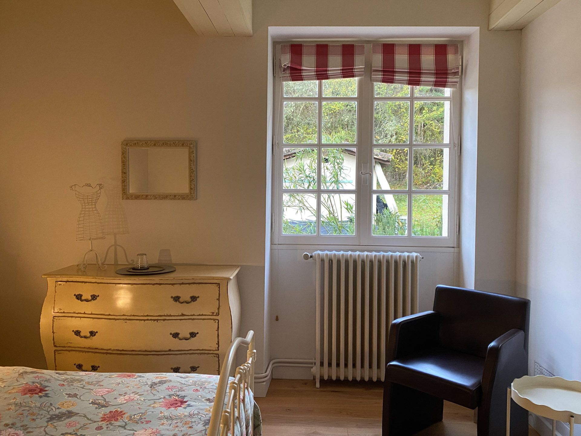 Das La Grande Chambre (ca. 20 m²) ist ein stiller, klarer Raum. Die beiden tief liegenden Sprossenfenster liegen tief in den jahrhundertalten Mauern und öffnen den Blick in den großen, naturbelassenen Garten. Die hellgrauen Deckenbalken und die warmen Holztöne der Möbel schaffen eine ruhige, schützende Atmosphäre, die dich sofort ankommen lässt.