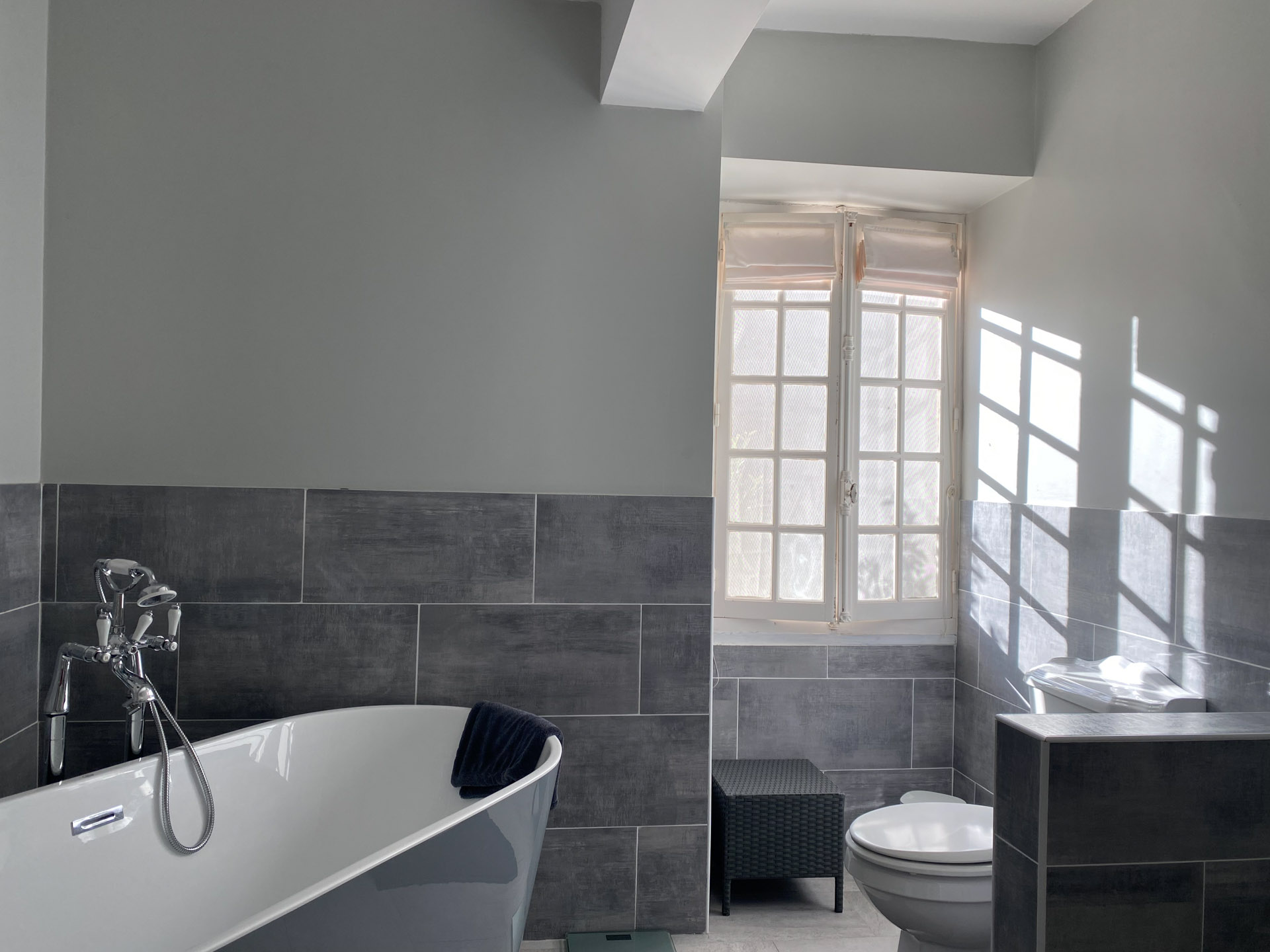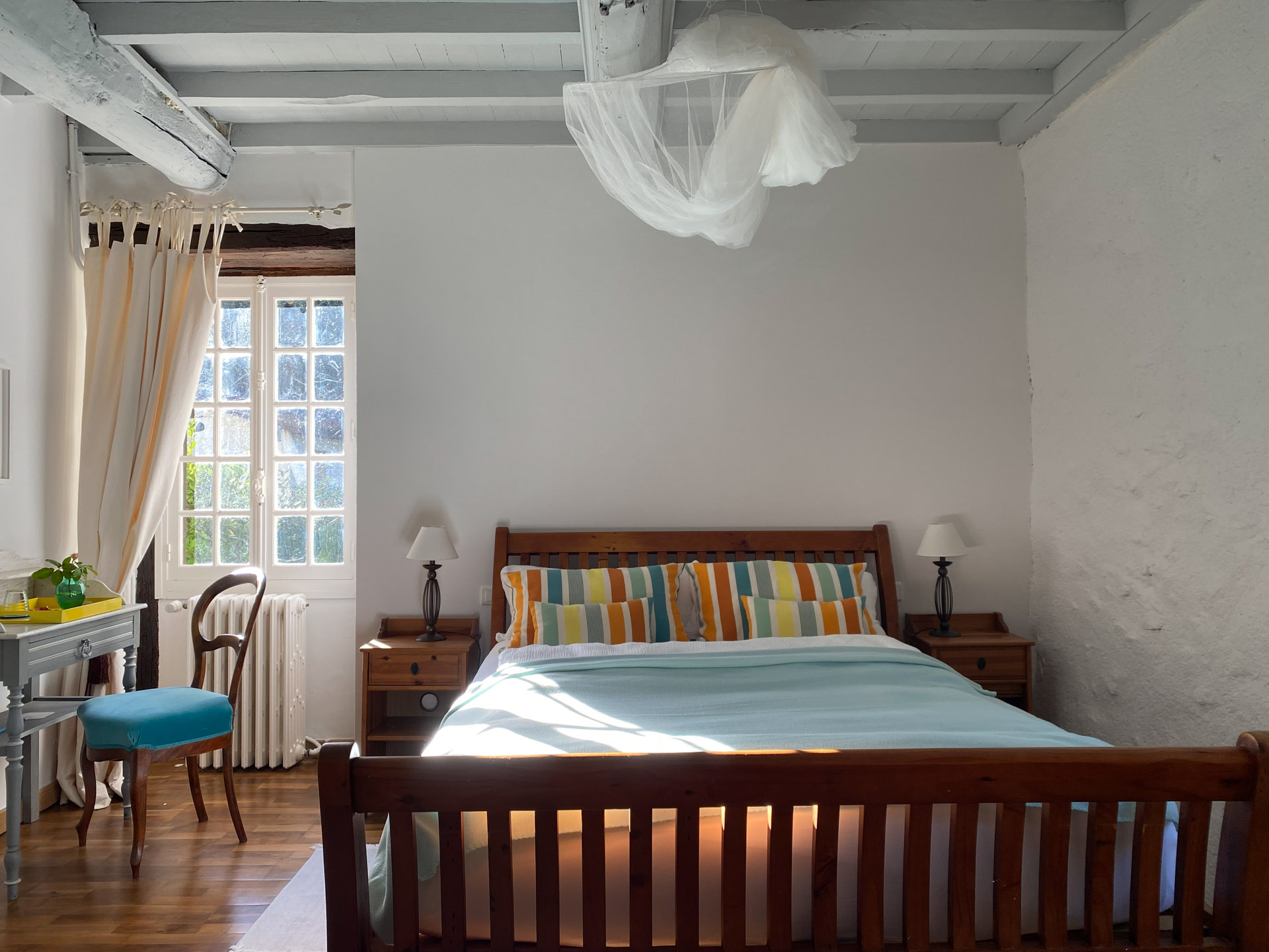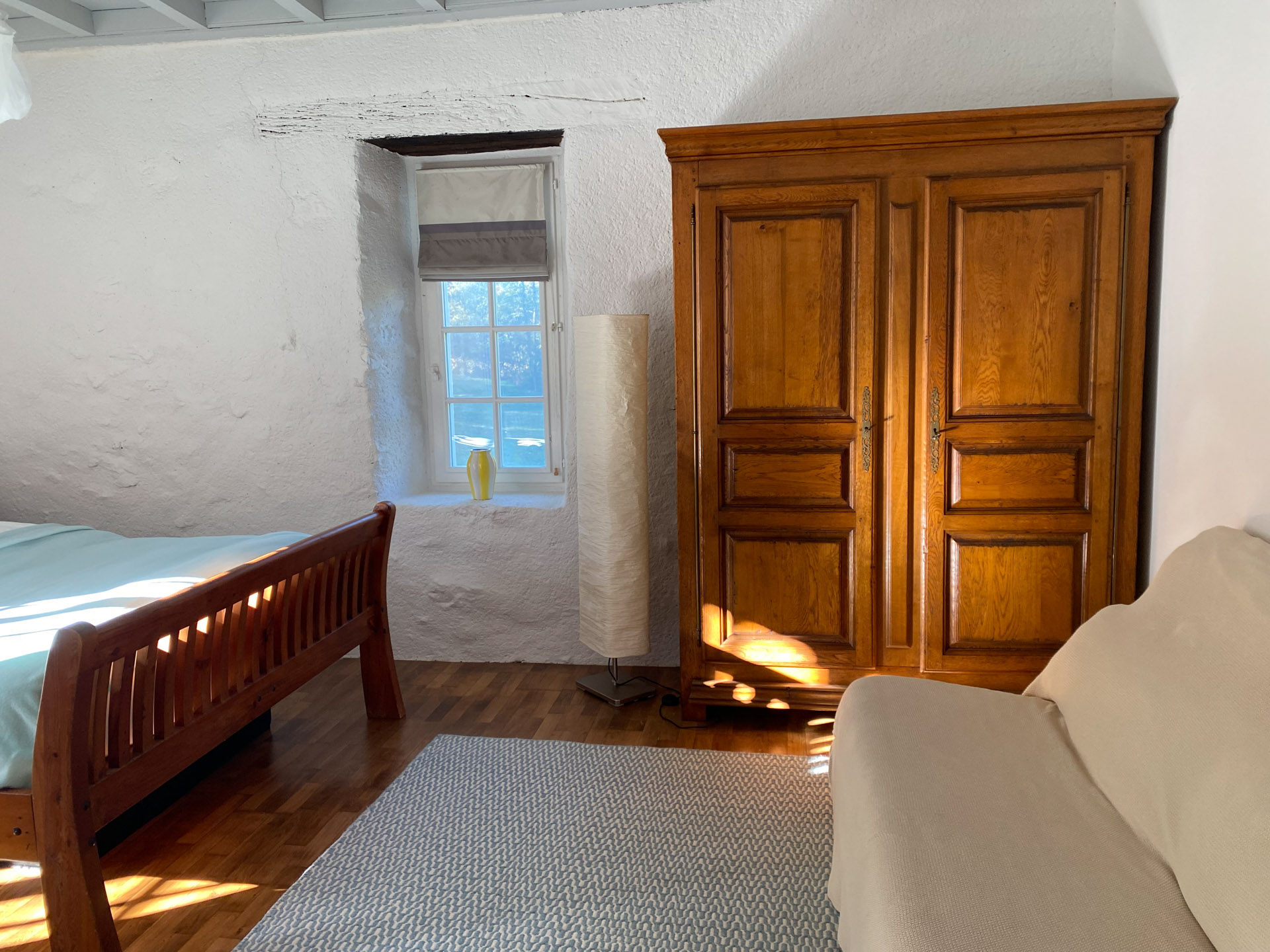 La Chambre Lavande ist ein stiller, klarer Raum. Die beiden tief liegenden Sprossenfenster liegen in den jahrhundertalten Mauern und öffnen den Blick in den großen, naturbelassenen Garten. Die hellgrauen Deckenbalken und die warmen Holztöne der Möbel schaffen eine ruhige, schützende Atmosphäre, die dich sofort ankommen lässt.