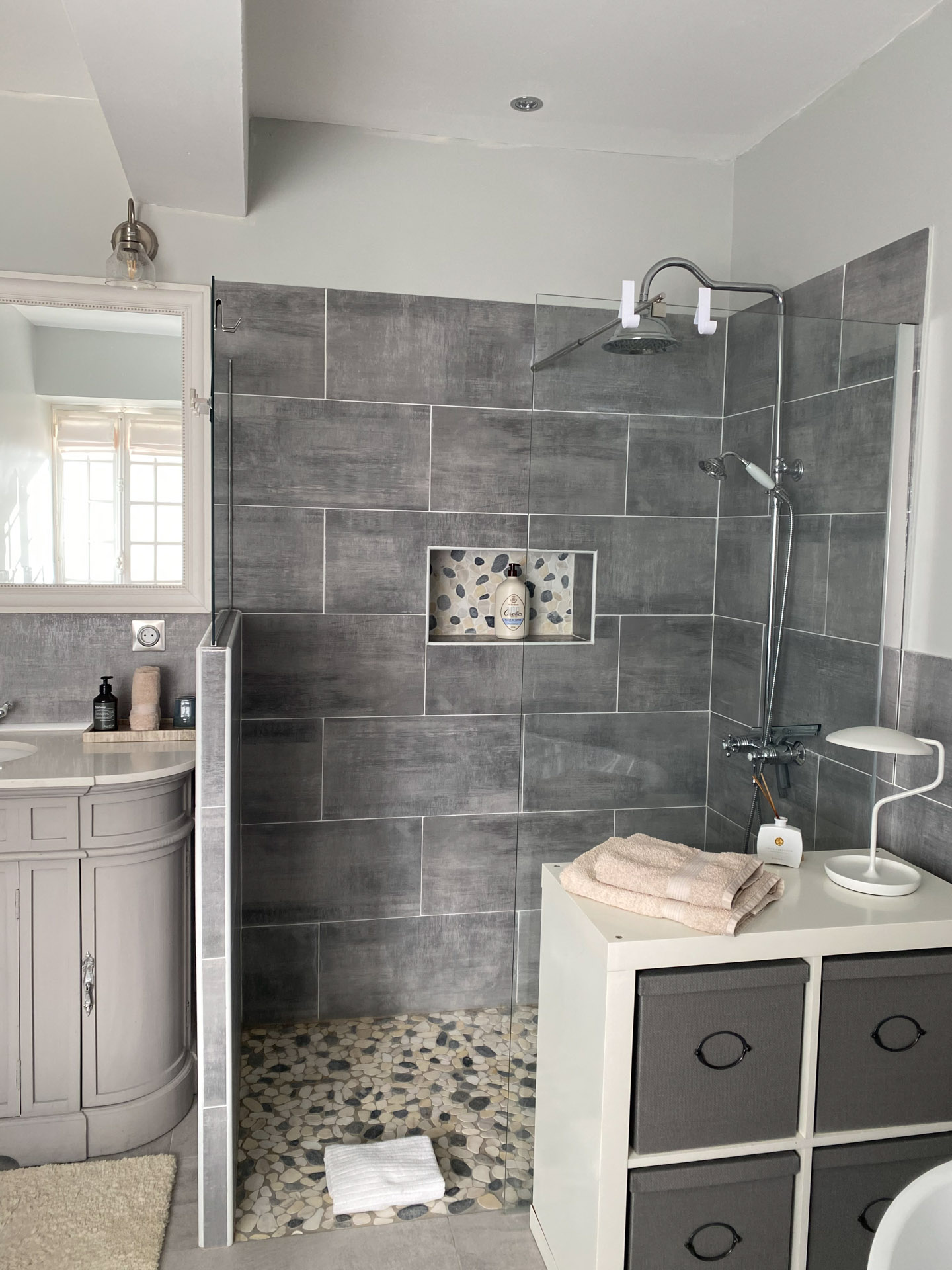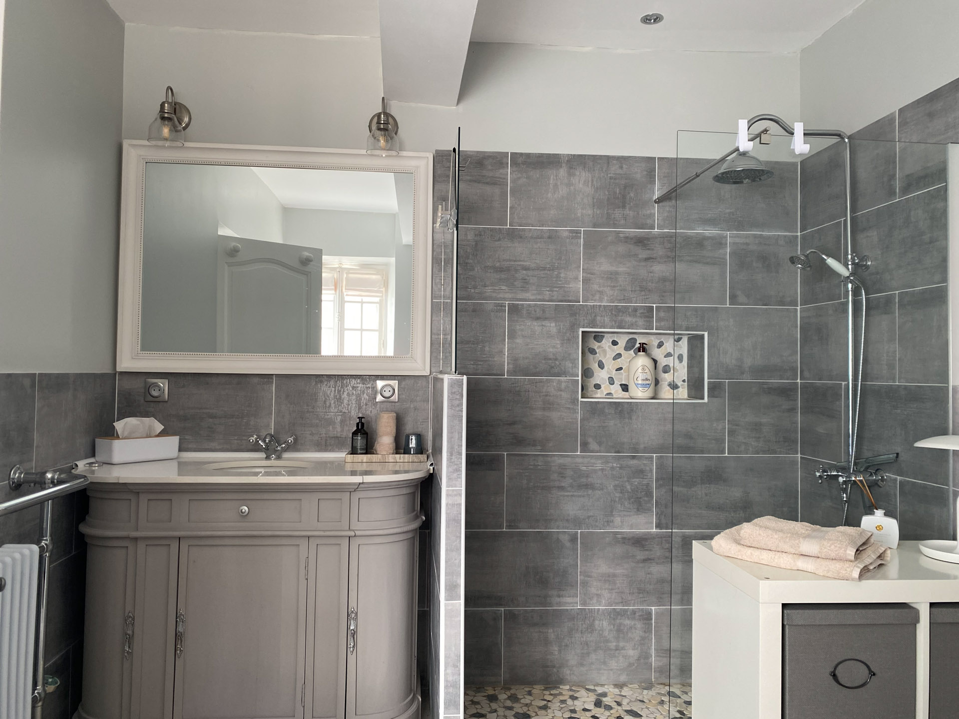 - Walk-in-Dusche mit Natursteinboden