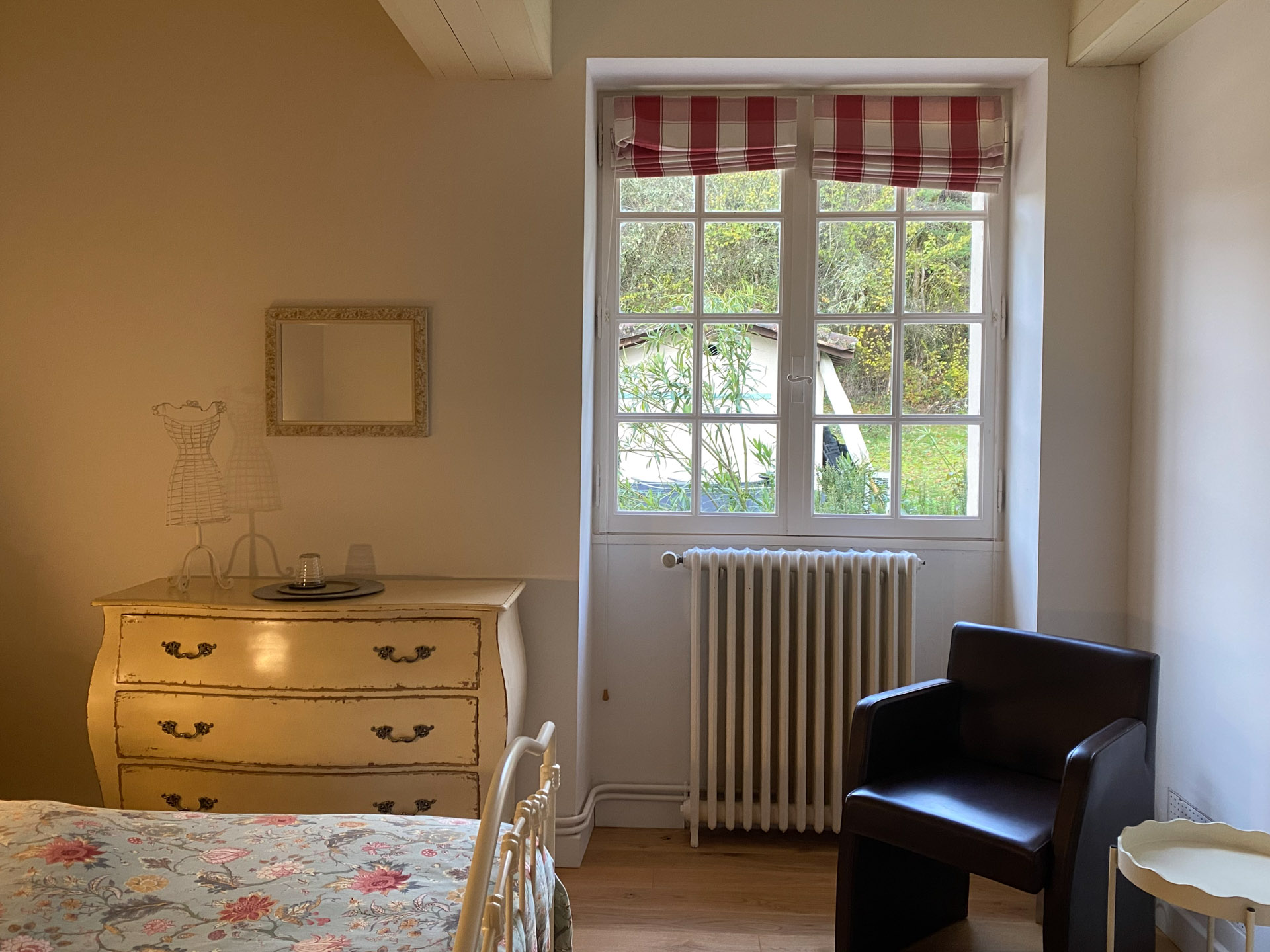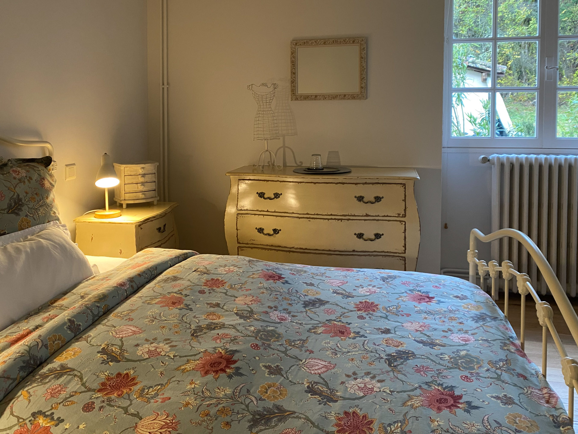 La Chambre Rose ist ein heller, freundlicher Raum mit einem Fenster und Blick auf den Pool und ins Grüne. Die sanft-vintage Anmutung mit ausgewählten, romantisch wirkenden Details macht diesen Raum besonders für Menschen anziehend, die einen weichen, behüteten Rückzugsort möchten und gern näher am Herzen des Hauses sind.
