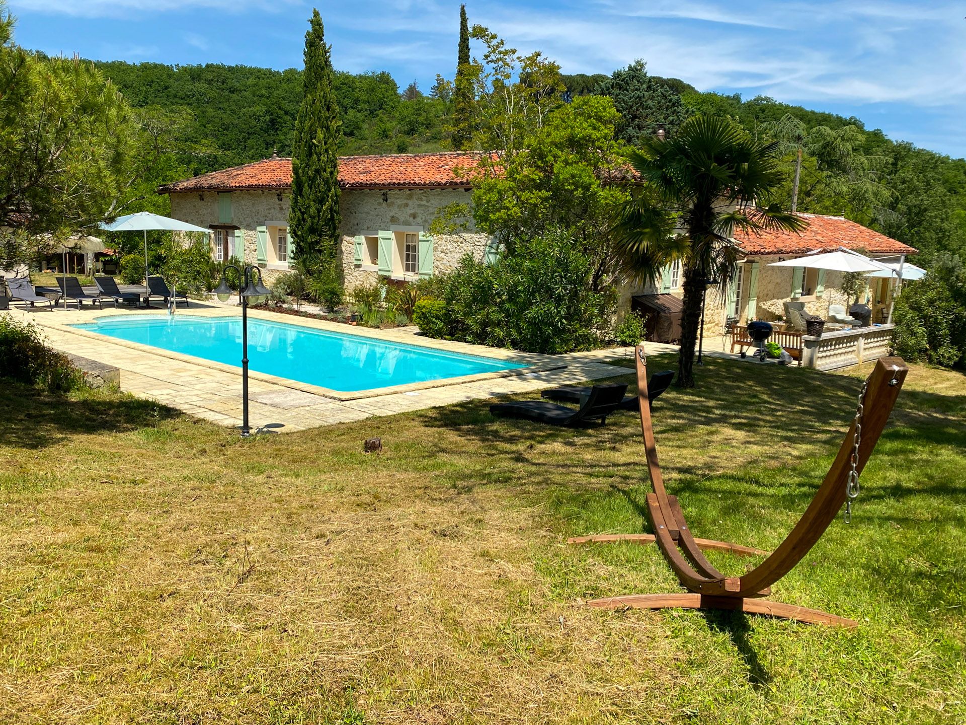 Unser Außenbereich ist bewusst kein perfekt modellierter Garten, sondern ein Ort, an dem du die sanfte Hügellandschaft des Gers unmittelbar spürst. Zwischen alten Bäumen, duftenden Kräutern wie Rosmarin, Lavendel und Thymian findest du überall Rückzugsplätze, an denen du einfach nur sitzen, schauen und deine Seele baumeln lassen kannst. Oder du hängst in der Hängematte ab.